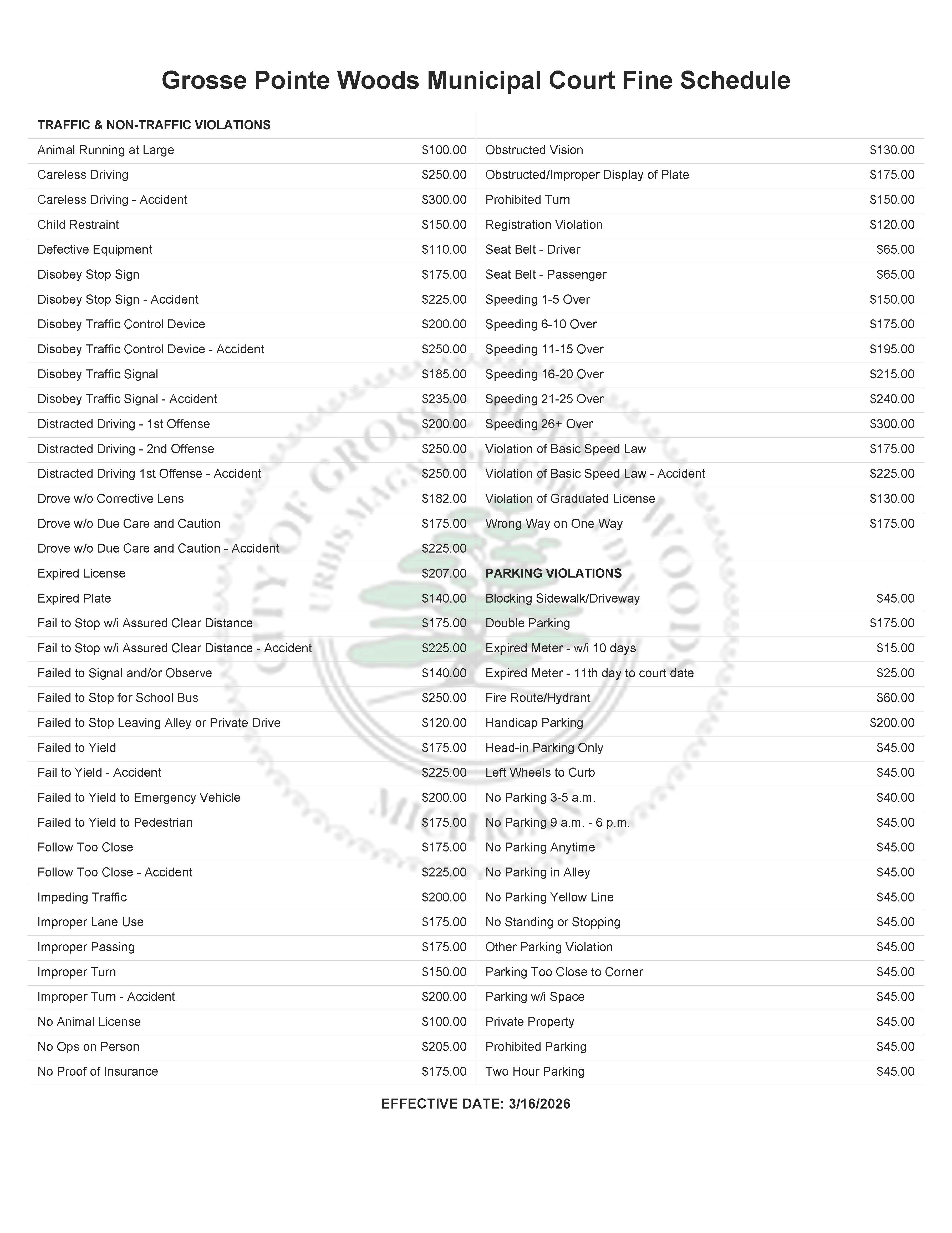 The schedule of fines are effective 3/16/2026: